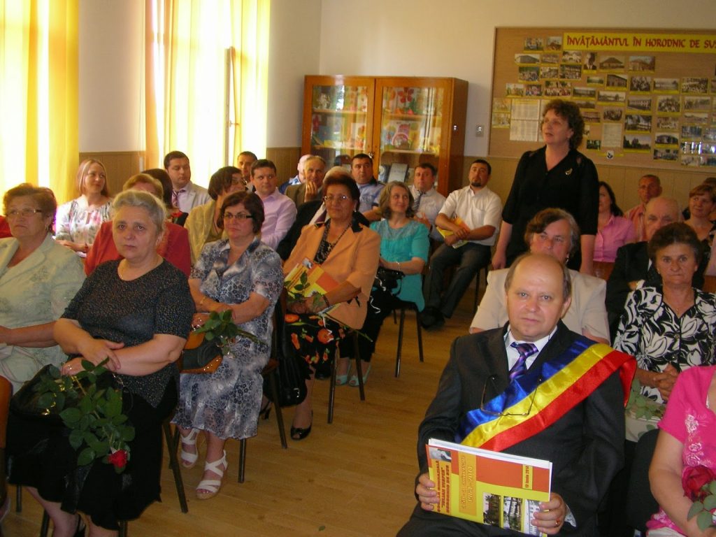 Profesorul Mihai Semenov din Bacău, bucovinean de-al nostru, care m-a însoțit la această manifestare, le-a propus gazdelor să organizeze un schimb de experiență cu cadrele didactice de la Școala ”Ion Creangă” din municipiul Bacău, școală pe care a păstorit-o ca director aproape 20 de ani. Răspunsul îl va primi într-un termen scurt. Activitățile au continuat la noua sală de sport a școlii. Aici au evoluat Ansamblul folcloric ”Mugurașii” ( înv. Magdalena Onica), care s-a întors recent, cu lauri, de la  un festival de datini populare; clasa aII-a (Mariana Grosu) a prezentat sceneta ”Isprăvile lui Păcală”. Foarte interesant a fost și momentul prezentării costumului popular bucovinean horodnicean, în versuri, de către elevii clasei pregătitoare. Așa cum ne-am obișnuit déjà, surorile Iuliana și Ionela Luța, liceene, au prezentat un buchet de melodii populare bucovinene. Frumusețea lor ingenuă, a costumlui popular bucovinea, ce-l purtau și  interpretarea lor de excepție, le-au adus aplauze la scenă deschisă.