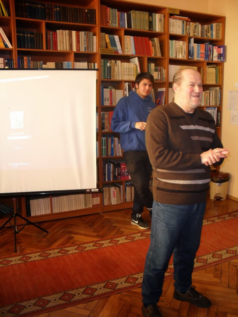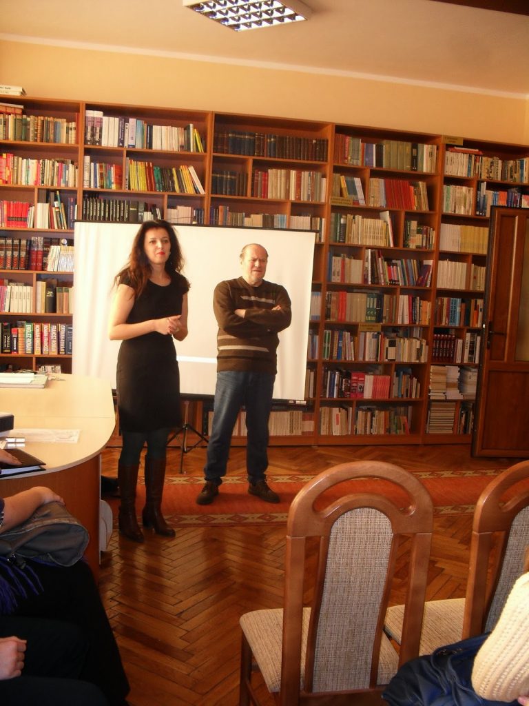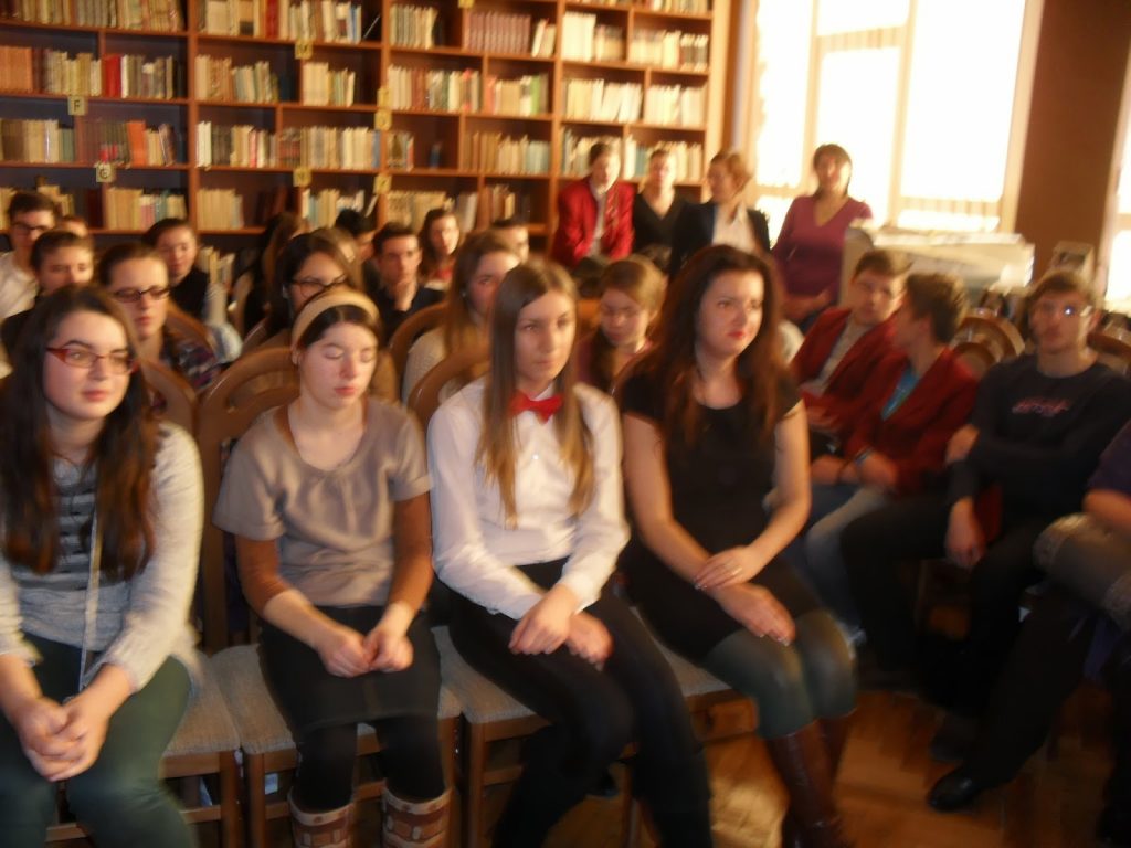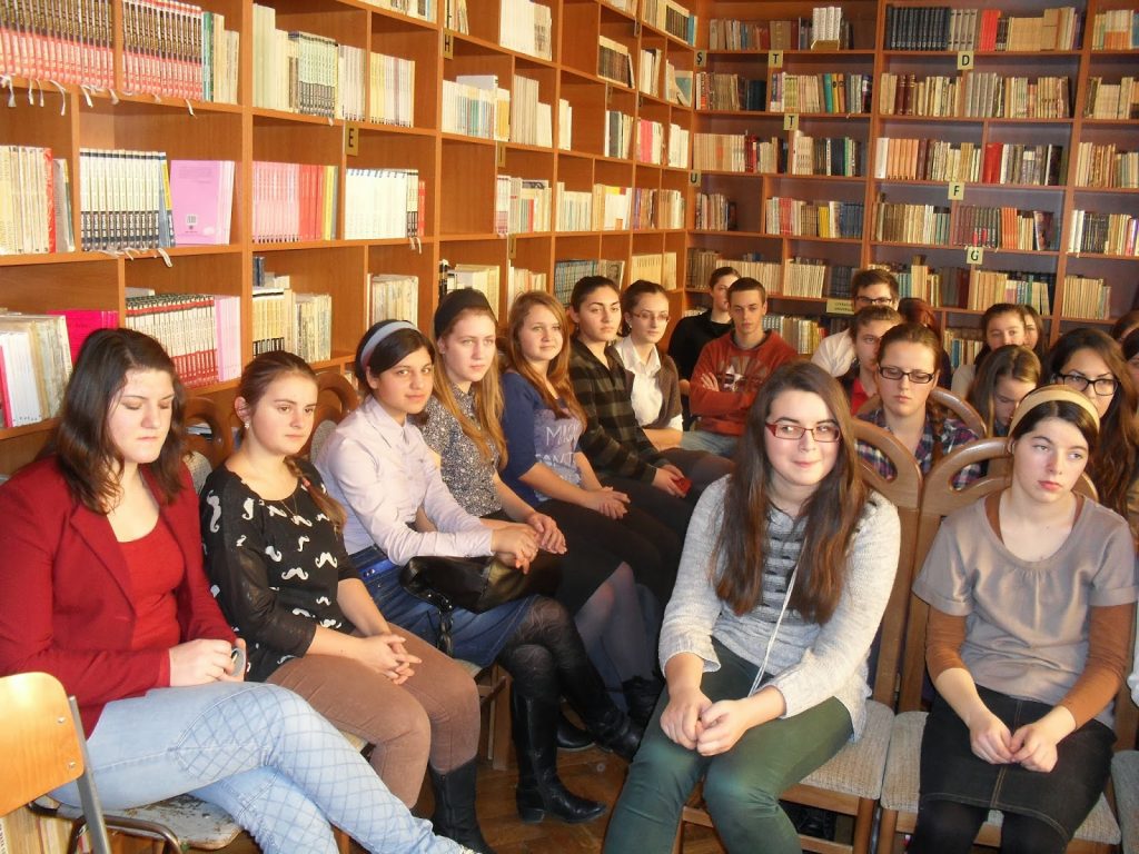 A urmat un film documentar. Maestrul, cu ajutorul videoproiectorului, a prezentat interviul pe care l-a realizat în primăvara acestui an la Sucevița. protagoniști au fost dramaturgul Matei Vișniec scriitorii Carmen Steiciuc și Ion Filipciuc, precum și conf. univ. dr. Pătrașcu , pictor, de la institutul de arte plastice ieșean. Autorii aveau și cărțile lor pe masă. Discuția a fost foarte interesantă. S-a discutat despre așezarea ei în munții Bucovinei, cultura populară, obiceiuri și tradiții. A fost foarte interesant. Și-a mai fost ceva coole și ce-mi place mie foarte mult când merg într-o colectivitate, mai ales de elevi: liniște perfectă, fără șușoteli, fără râsete pe înfundate. Ce mai, disciplină ca într-o unitate de învățământ. Și, cum ar zice maestrul Dumbi ”Bravos, pughibalelor!”