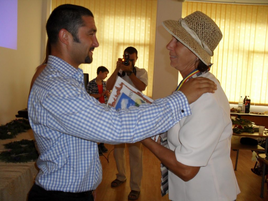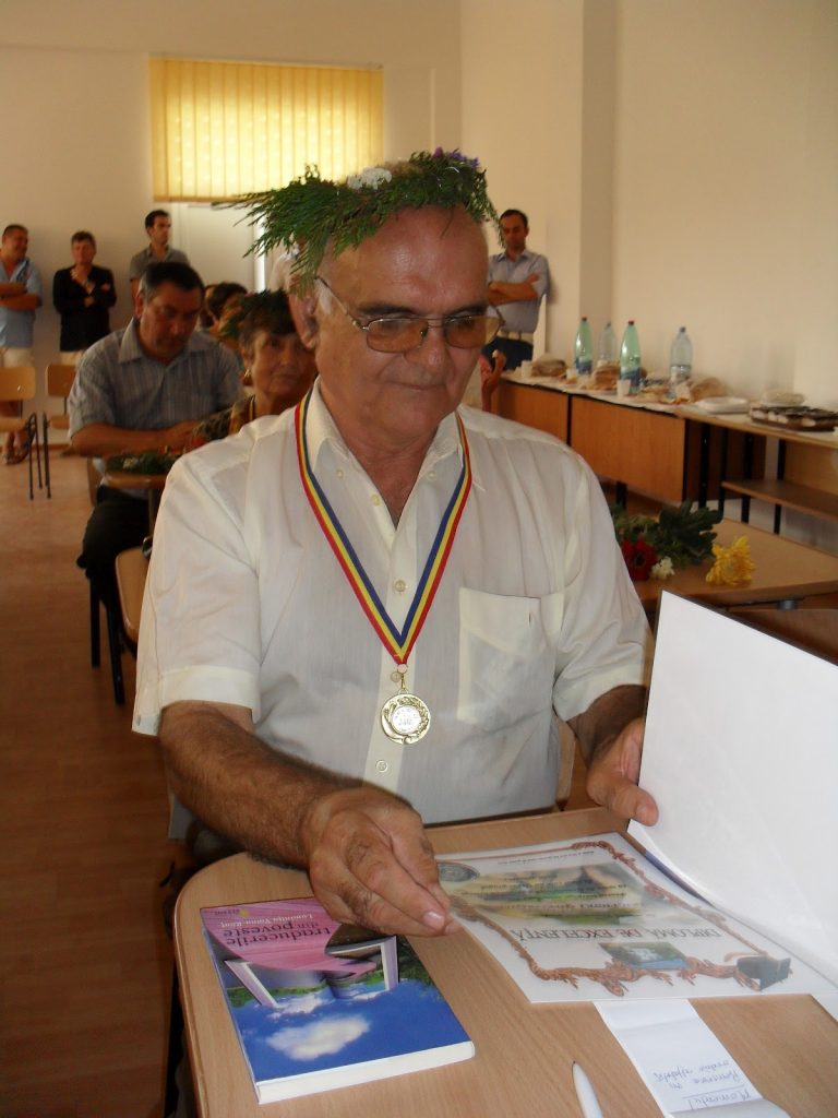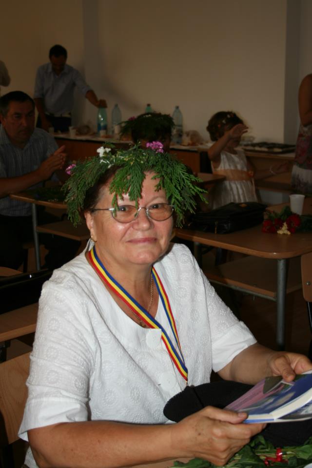 A urmat strigarea catalogului cadrelor didactice de către Ioana Bujei (Leonte). Să fi văzut educatoare, învăţători şi profesori cum se ridicau cuminţi şi spuneau „Prezent!”. Fiecărui cadru didactic i s-a înmânat o diplomă de excelenţă, o medalie jubiliară , un buchet de flori, iar pe cap i s-a pus o coroniţă din frunze de stejar împodobită cu flori. Pe carte era scrisă o dedicaţie de suflet, strict referitoare la modelatorii de suflete şi de atitudini. Cred c-aţi fi dat orice vi s-ar fi cerut ca să vedeţi oameni cu buchete de ghiocei la tâmple ce ţanţoşi stăteau cu coroniţa pe ca, cu medalia pe piept, la care strângeau diplome şi florile ! Se pare că aşa ceva nu le este dat multora să vadă.